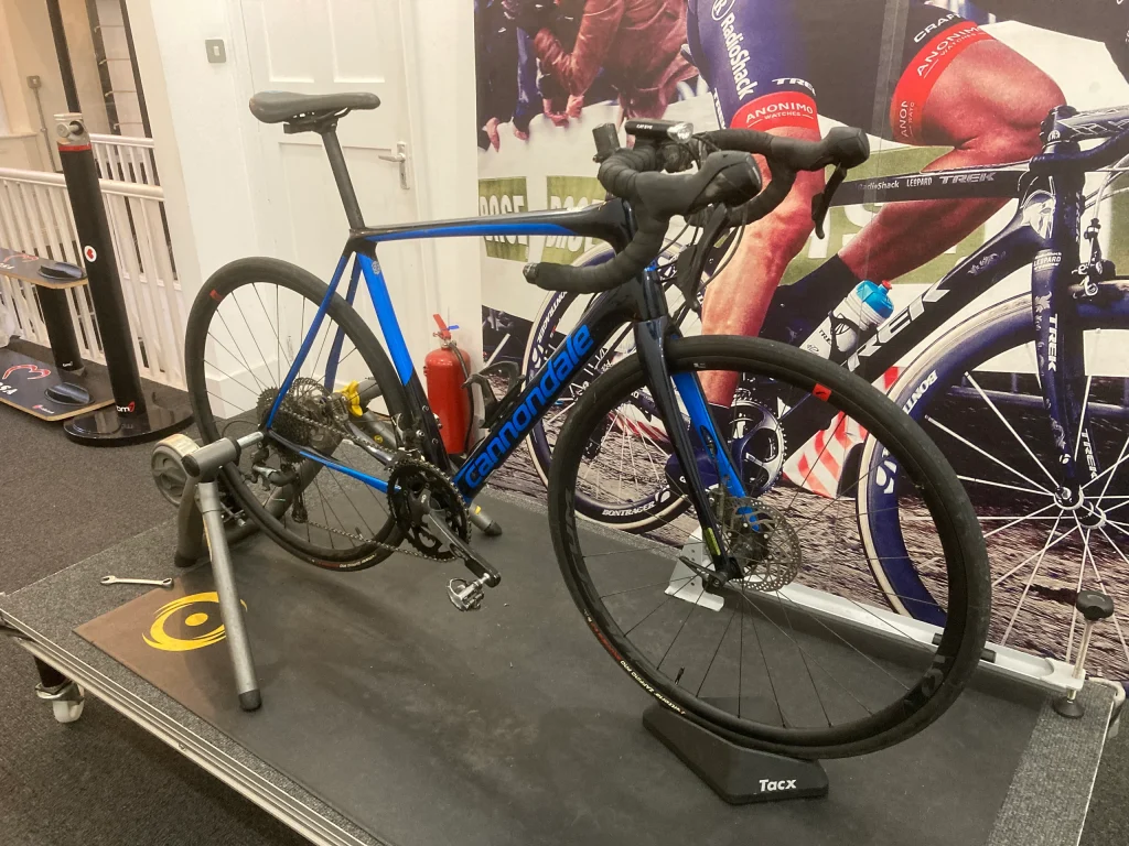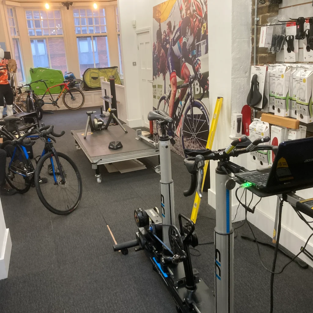 On arrival, the bike fitter, Paul Smith, took me and my bike to the first-floor bike fitting studio, and set the bike up in a turbo-trainer. I had already provided the make and model of the bike, and Paul had downloaded the basic geometry into his spreadsheet.