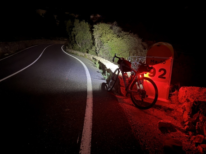 I was glad of the hour long rest and the pizza. I was even more glad that Lisa let me follow her wheel through Port de Pollença, then Pollença and onto the lower slopes of the road that heads up the Col de Femenia. The last good thing was having the opportunity to lighten my load a little by giving her all my surplus items ahead of the final climbs. I waved goodbye, and once again was alone. It was quite late, the sun set and darkness surrounded me.