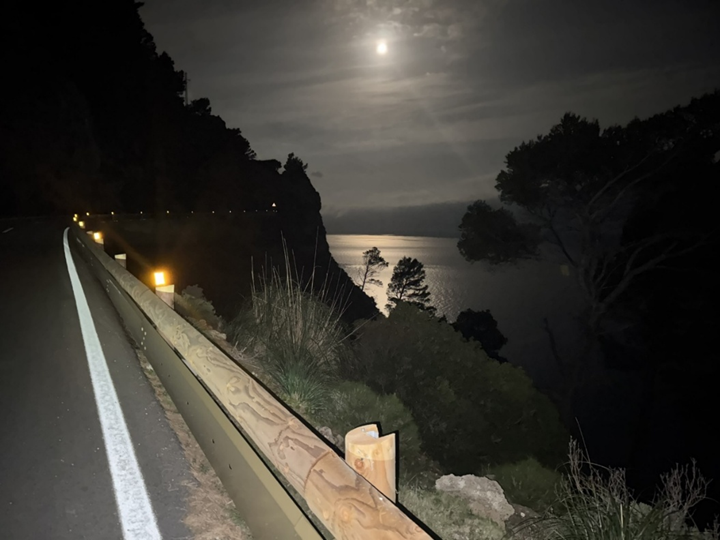 The bars were emptying in Port de Sóller and I’m sure the people who saw me wondered why I was out so late. It was a calm, cool, cloudy night with the moon occasionally appearing to the south, it was good to be on the move. On the outskirts of Sóller I turned right onto the Ma-10 and felt the superb smooth dark tarmac passing easily under my wheels. The switchback hairpins arrived soon after and I settled into the first of many climbs on the Ma-10 between Sóller and Andratx.